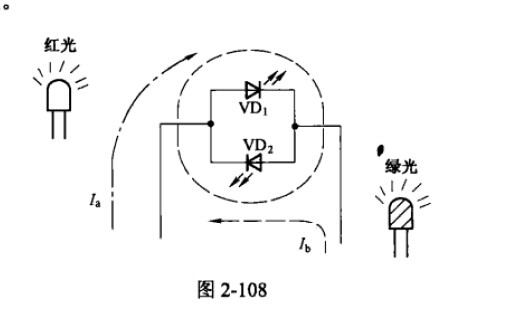 1、雙色發(fā)光二極管。它是將兩種發(fā)光顏色(常見(jiàn)的為紅色和綠色)的發(fā)光二極管管芯反向并聯(lián)后封裝在一起,如圖2-108所示。當(dāng)工作電壓為左正右負(fù)時(shí),電流Ia通過(guò)管芯VD1使其發(fā)紅光;當(dāng)工作電壓為左負(fù)右正時(shí),電流Ib通過(guò)管芯VD2使其發(fā)綠光。