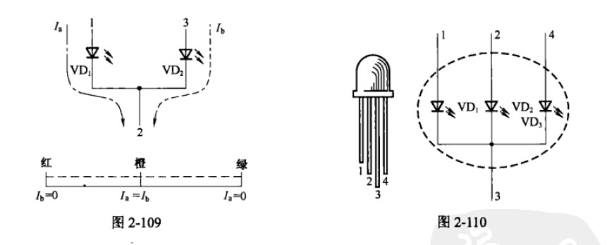 2、三引腳變色LED。它是將兩種發(fā)光顏色(通常為紅色和綠色)的發(fā)光二極管管芯負(fù)極聯(lián)系在一起作為公共負(fù)極,令兩引腳分別為紅色和綠色管芯的正極。電流Ia通過(guò)管芯VD1使其發(fā)紅光,電流Ib通過(guò)管芯VD2使其發(fā)綠光,電流Ia=Ib并同時(shí)通過(guò)管芯時(shí)LED發(fā)橙色光,當(dāng)Ia與Ib的比例不同時(shí),LED發(fā)光顏色按比例在紅-橙-綠間變化,如圖2-109所示。